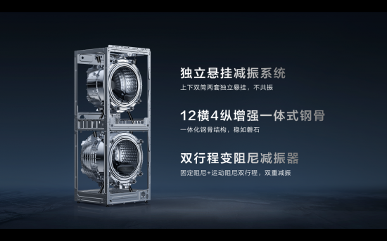 TCL研發(fā)團(tuán)隊(duì)在雙子艙Q10中采用雙直驅(qū)變頻電機(jī),并使用了雙行程變阻尼減振器;以建筑減震結(jié)構(gòu)做參考,采用獨(dú)特的 12 橫 4 縱的整機(jī)一體式鋼骨結(jié)構(gòu),再通過(guò)仿真模態(tài)技術(shù),最終成功做出擁有“行業(yè)最大上筒”的復(fù)式分區(qū)雙滾筒。