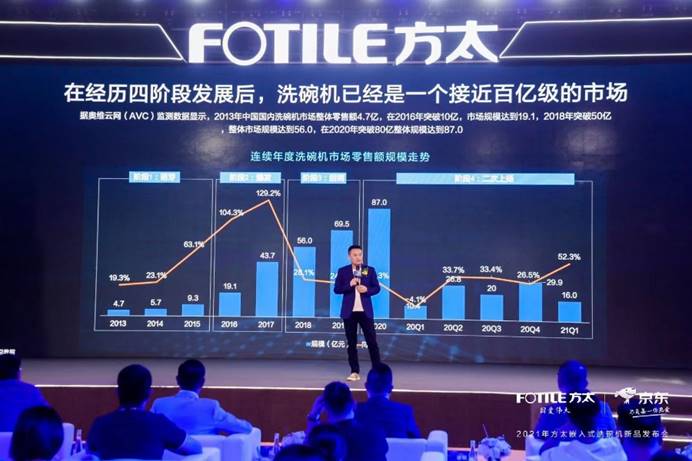 奧維云網(wǎng)總裁郭梅德的發(fā)言中從整體家電大盤數(shù)據(jù)的宏觀角度切入,他強(qiáng)調(diào)洗碗機(jī)進(jìn)入中國(guó)市場(chǎng)已有二十多年,回顧洗碗機(jī)在中國(guó)市場(chǎng)的發(fā)展,大致可分為4個(gè)階段。2013年-2015年為萌芽階段,消費(fèi)者對(duì)洗碗機(jī)品類的認(rèn)知相對(duì)較淺,購(gòu)買廚電產(chǎn)品時(shí)更多關(guān)注基本需求,而非品質(zhì)需求。洗碗機(jī)在當(dāng)時(shí)屬于由外資主導(dǎo)的小眾產(chǎn)品;2015年起,洗碗機(jī)進(jìn)入爆發(fā)階段。當(dāng)時(shí)方太全球首發(fā)的水槽式洗碗機(jī),迅速激活國(guó)內(nèi)洗碗機(jī)市場(chǎng)。進(jìn)入2018年,洗碗機(jī)品類自身發(fā)展進(jìn)入瓶頸,加之房地產(chǎn)限購(gòu)政策影響,市場(chǎng)開(kāi)始回調(diào)。同時(shí),水槽式產(chǎn)品逐漸被嵌入式替代;2020年至今,受疫情推動(dòng),洗碗機(jī)進(jìn)入二次爆發(fā)階段。消費(fèi)者購(gòu)買傾向呈現(xiàn)套系化。消費(fèi)者流量雖下降,但客單量大幅提升。奧維云網(wǎng)(AVC)推總預(yù)測(cè)數(shù)據(jù)顯示,2020年臺(tái)式產(chǎn)品的短暫性爆發(fā)過(guò)渡到2021年后將不再延續(xù),21年洗碗機(jī)零售量將在20年基數(shù)上小幅回落至19.9%的增速,同時(shí)在規(guī)模方面因?yàn)?a href=http://www.13269526841.cn/ target=_blank class=infotextkey>價(jià)格改善,市場(chǎng)將首次突破100億。方太此次發(fā)布嵌入式洗碗機(jī)是對(duì)自身產(chǎn)品布局一次強(qiáng)有力的補(bǔ)位,更是彰顯著方太對(duì)未來(lái)超百億級(jí)市場(chǎng)絕對(duì)的信心和領(lǐng)導(dǎo)力。