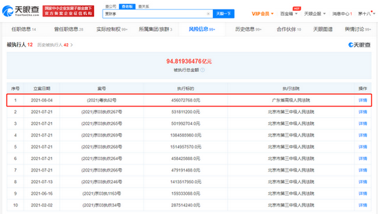 【劃重點(diǎn)】: 8月5日上午消息,天眼查App顯示,8月4日,賈躍亭新增一則被執(zhí)行人信息,案號(hào)(2021)粵執(zhí)62號(hào),執(zhí)行標(biāo)的約4.56億元,執(zhí)行法院為廣東省高級(jí)人民法院。關(guān)聯(lián)案件為平安銀行股份有限公司深圳分行與樂視控