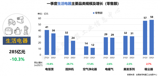 全國家用電器工業信息中心研究員楊征對《2022年中國家電行業一季度報告》進行了全面解讀。2022年一季度家電行業國內累計銷售額1540億元(品類涉及彩電、白電、廚衛、小家電產品),較上一年同比下降12.3%。另據海關總署數據顯示,2022年1-3月我國家電產品出口額累計1370億元(人民幣值),同比下降7.3%。各地疫情頻發導致線上線下銷售均受到不同程度的影響,其中線上零售額同比下滑4.4%,線下零售額同比下滑幅度達到19.4%。