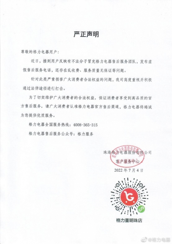 7月4日,格力發布嚴正聲明,稱“接到用戶反映有不法分子冒充格力電器售后服務團隊,發布虛假售后服務電話,還存在亂收費、服務質量無保證等問題。”為此,格力還在聲明中提醒消費者認準格力電器官方售后渠道——格力電器全國服務熱線4008-365-315,格力電器售后服務公眾號:格力服務。