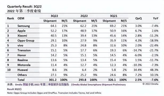 市場研究機(jī)構(gòu)Omdia公布的全球手機(jī)品牌銷量榜顯示,2022年第二、三季度全球手機(jī)銷量榜前十名中,除蘋果、三星外,其余8席均被中國品牌攬入懷中,小米、OPPO、vivo、榮耀、Realme、華為等均榜上有名。