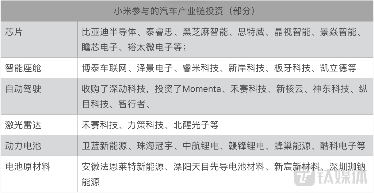 據鈦媒體App不完全統計,小米已投資了50+家汽車供應鏈企業,投資重點集中于汽車智能化、動力電池、激光雷達等領域。