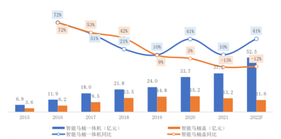市場數據也有印證。2022全年,我國智能坐便器預計實現線上銷售額64億元,同比增長27%,在天貓的618和京東雙11戰報中,智能坐便器銷售均實現一騎絕塵,增長率遠優于其他家電品類。