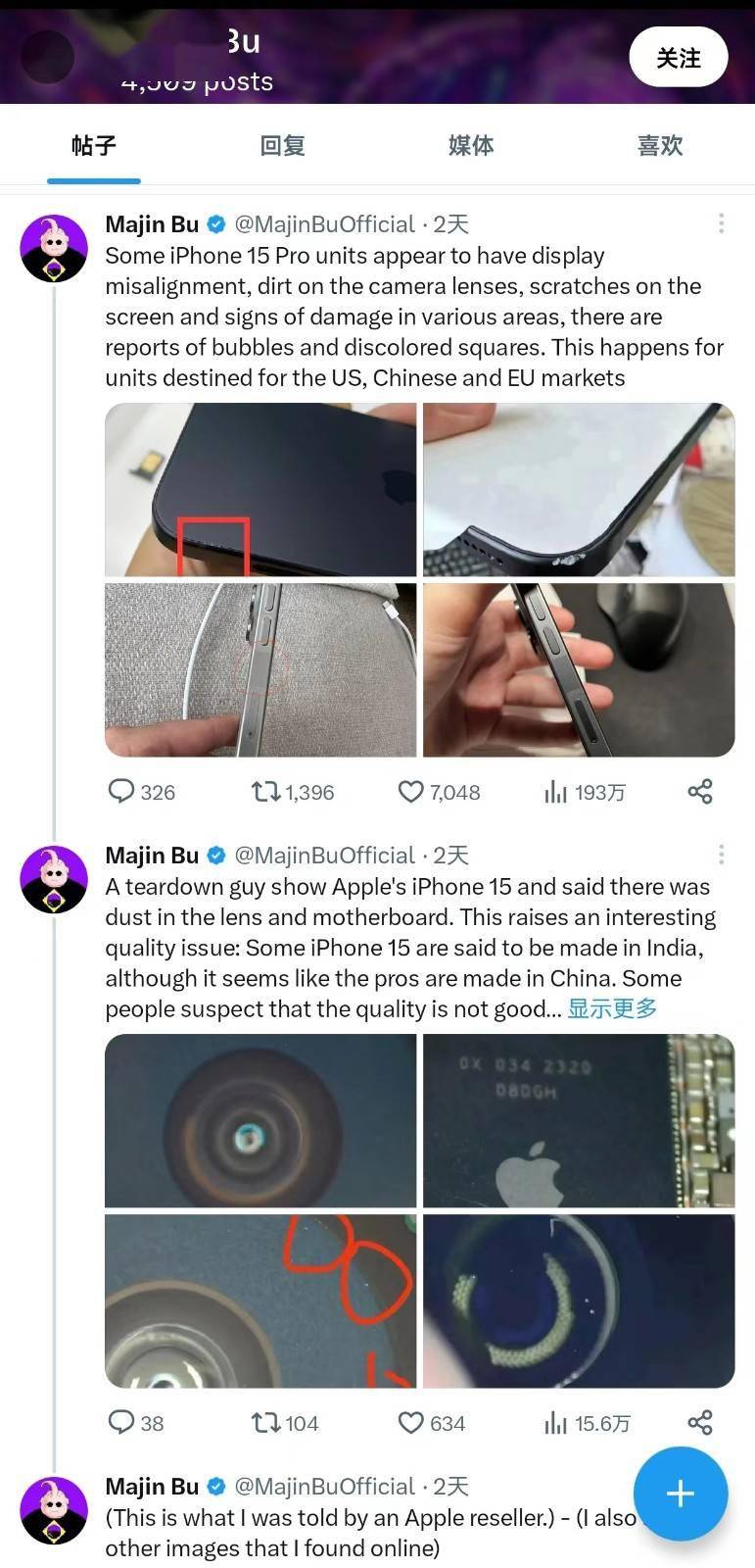 【劃重點】: 9月26日消息,近日有國外網友在X上分享首批iPhone15Pro的新機,多款均出現瑕疵情況。目前蘋果公司尚未對該問題作出回應。 分享