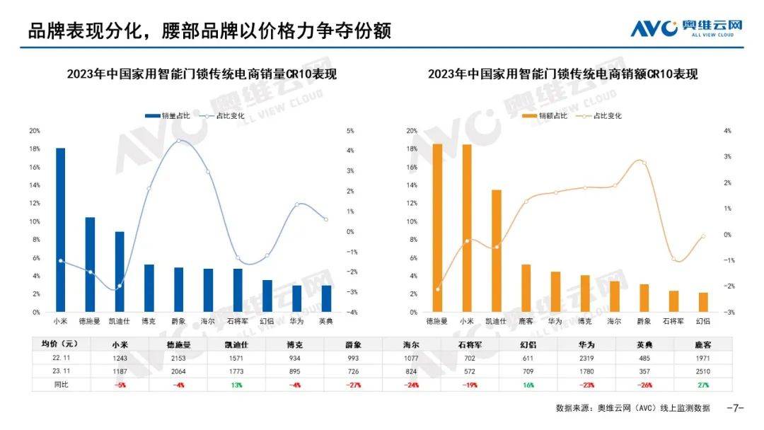 奧維云網(AVC)線上監測數據顯示,2024年一季度,中國家用智能門鎖行業線上整體市場均價為992元,進入千元以下。