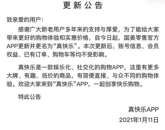 【劃重點】: 兩年兜兜轉(zhuǎn)轉(zhuǎn),國美還是選擇了再改一次名。 根據(jù)蘋果商店版本歷史記錄顯示,近期國美線上電商平臺“真快樂”app發(fā)布了新版本,除了常規(guī)的修復(fù)bug、優(yōu)化產(chǎn)品體驗之外,最大的改變
